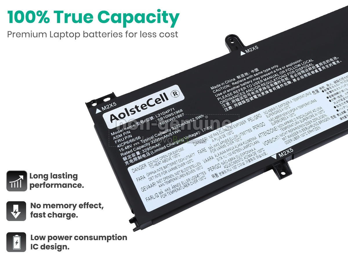 Our Lenovo ThinkPad T14 GEN 3 (AMD)-21CF002RGM battery is 100% real capacity, rejecting false identification or using inferior material. We select high-quality A+ batteries, so the battery can be recharged and discharged 800+ times that used for more than 3 years.